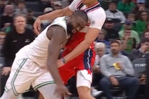 相关新闻>>>又一个受害者💀杰伦·布朗撞到K·乔治 发际线粉全粘白T恤上了