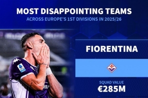 体育资讯11月7日讯 德国转会市场根据球队的身价和目前的排名,列出了本赛季欧洲顶级联赛最令人失望球队,佛罗伦萨、纽卡、毕尔巴鄂竞技在列。