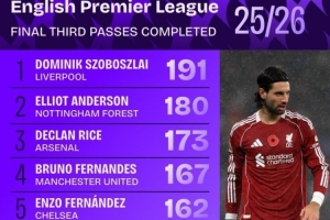 英超进攻三区成功传球榜:索博压安德森居首 赖斯、B费、恩佐在列