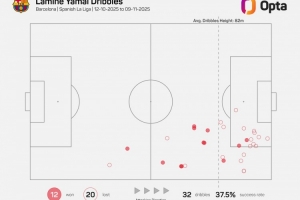Opta指出,10月12日以来,亚马尔联赛尝试过人32次,与图卢兹球员博霍并列五大联赛最多,过人成功率37.5%。