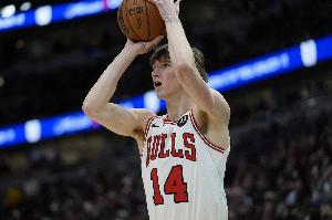 公牛球员布泽利斯上半场表现不错,三分线外百发百中,冲抢篮板也还是很积极。