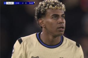 体育资讯11月26日讯 欧冠联赛阶段第5轮,切尔西主场迎战巴塞罗那,比赛第55分钟,埃斯特旺连过多人爆射得手,切尔西2-0领先,随后镜头立刻给到了亚马尔。