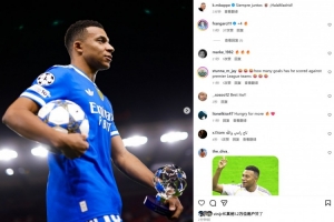 本场比赛姆巴佩上演大四喜,赛后他也在社媒晒出拿走比赛用球和全场最佳奖杯的照片,配文写道:“永远团结一致,皇马加油!”