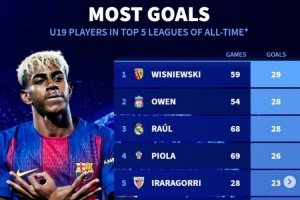 五大联赛历史U19进球榜:欧文、劳尔、姆巴佩在列,亚马尔暂列第9