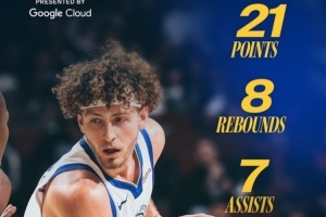 赛后,勇士官方晒出波杰姆斯基的数据海报,将其评选为本场最佳球员。