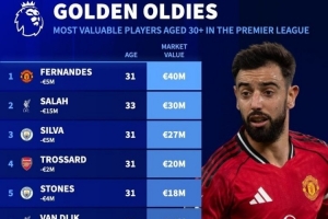 英超30岁以上球员德转身价排名:B费4000万欧居首,萨拉赫第二
