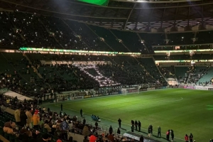 据“天天体育”报道,赛前工体北看台国安球迷用手电筒组成了足协杯冠军奖杯的形状,庆祝球队足协杯夺冠。