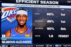 在单赛季所有场均至少30分的球员中,亚历山大真实命中率69%、三分命中率45%皆是历史第一;两分球命中率60%是历史第5,场均1.8失误是历史最少。