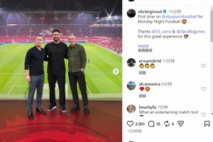 体育资讯12月16日讯 吉鲁更新社媒动态,晒出与卡拉格、大卫·琼斯(天空体育主持人)的合照。