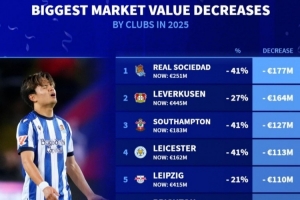 2025球队身价贬值榜:皇社-1.77亿、药厂-1.64亿 莱比锡、曼联在列