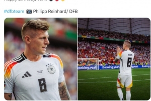 德国队官方社媒晒出克罗斯效力期间的照片,配文:“生日快乐,托尼!”