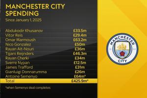 天空体育统计,过去12个月曼城转会总支出将超过4.25亿镑。