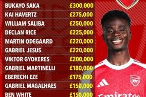 萨卡30万镑顶薪!阿森纳周薪:赖斯22.5万加布15万、马杜埃凯5万