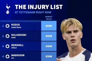 热刺伤员德转身价榜(总价2.55亿欧):