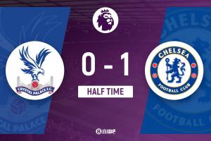 上半场伤停补时2分钟,半场结束,切尔西暂1-0水晶宫。