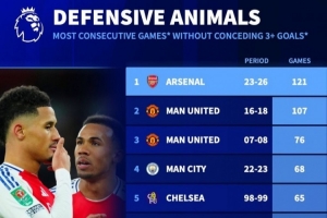 英超球队连续“单场不丢3球”榜:阿森纳121场居首,曼联位列次席