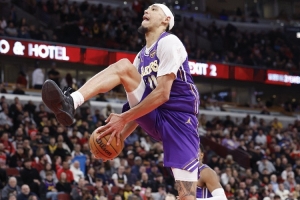 在此前湖人在客场以129-118击败公牛的比赛中,海斯曾上演抢断反击胯下暴扣的精彩戏码。