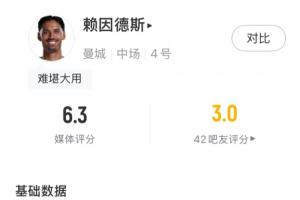 体育资讯02月02日讯 英超第24轮,热刺主场2-2战平曼城,本场比赛曼城中场赖因德斯替补出场20分钟,发挥平平。