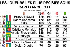 安切洛蒂治下参与进球榜:因扎吉175球第一,C罗第5但效率断档第1
