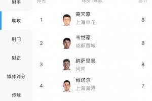 体育资讯9月1日讯 中超第23轮,蓉城球员韦世豪和河南队球员纳萨里奥分别送出助攻,两人追平高天意,三位球员以8次助攻并列中超助攻榜榜首。