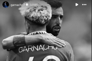 加纳乔社媒晒出自己与前队友B费的赛场合照,当时他身穿曼联49号球衣。