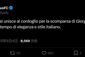 尤文官方写道:“尤文图斯俱乐部对乔治-阿玛尼的逝世表示哀悼,他是意大利优雅与风格的永恒象征。”