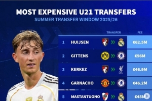 体育资讯9月5日讯 《转会市场》统计了今夏的U21球员最贵转会费榜单,皇马6250万签下赫伊森居首。