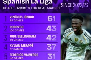 体育资讯9月7日讯 squakwa统计了22-23赛季以来皇马球员在西甲联赛的直接参与进球(进球+助攻)情况,维尼修斯居首。