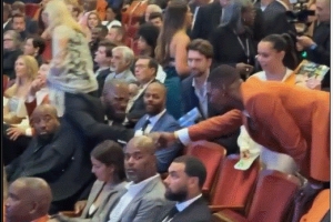 结束中国行返美的勒布朗-詹姆斯也现身颁奖礼,他在现场和波什握手寒暄致意。