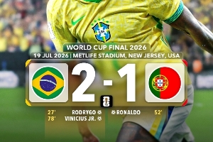 巴西2-1葡萄牙,罗德里戈先拔头筹,C罗下半场扳平比分,维尼修斯制胜。