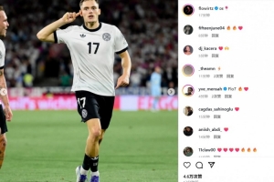 维尔茨也在赛后通过社媒晒出自己进球后的单手捂耳朵庆祝照,并配文:“德国队”。