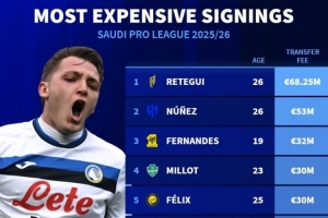 体育资讯9月12日讯 沙特今夏转会窗已经关闭,《转会市场》也统计了沙特今夏最贵引援榜,雷特吉居首,5人年龄不高于23岁。
