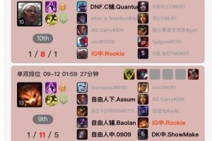 体育资讯9月13日讯 根据韩服排位统计小程序显示,iG中单Rookie韩服账户连续在多场对局里选用上单英雄,但战绩惨淡连续四场负战绩落败。