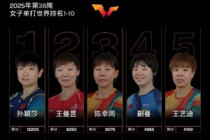 女子单打,孙颖莎、王曼昱、陈幸同、蒯曼、王艺迪位列前五,陈熠位列第九,孙颖莎积分超过10000分达到12200分。