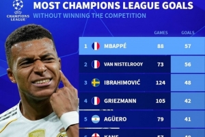 体育资讯9月17日讯 德国转会市场统计了没有赢得欧冠球员的欧冠进球数量,并列出榜单,姆巴佩57球居首。