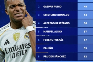 姆巴佩打进50球用了64场比赛,在皇马队史排名第9。