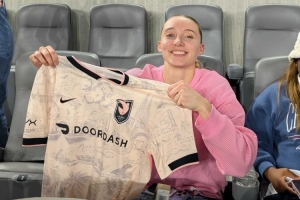 在比赛间隙,佩奇还获赠了天使城足球为其定制的球衣。而在赛后华盛顿精神队球员Croix Bethune(上赛季最佳新秀的)、Trinity Rodman纷纷找到佩奇并合影。