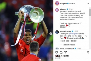 拜仁官方社媒晒出博阿滕效力球队期间捧起欧冠奖杯的照片,并写道:“德甲冠军、德国杯冠军、欧冠冠军、世界冠军,博阿滕已经宣布退役。感谢你在拜仁的时光!”