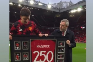 马奎尔上场比赛达成曼联生涯250场里程碑,此役领取了纪念球衣,B费社媒晒出视频,配文:“重大成就,当之无愧,大个子。”