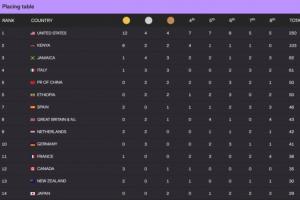 东京世锦赛官网更新名次得分表,夺得12金4银4铜的美国以250分断层领跑,6金2银2铜的肯尼亚以103分排第2,2银2铜的中国50分与埃塞俄比亚并列第5,东道主日本29分第14、韩国7分第43。