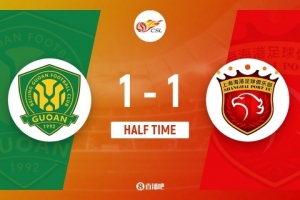 伤停补时6分钟。上半场比赛结束,北京国安1-1上海海港。