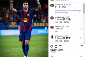 费兰-托雷斯赛后在社交媒体上晒出照片,庆祝取胜+打进2球,配文:“🦈+💧=⚽️⚽️”