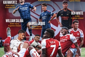 体育资讯9月23日讯 有博主制作阿森纳的伤病图,介绍了阿森纳目前的伤病情况。
