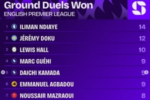 体育资讯9月24日讯 英超第5轮战罢,squawkafootball列各项数据排行,埃弗顿边锋恩迪亚耶是赢得地面对抗最多的球员,共计14次。