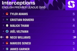 体育资讯9月24日讯 英超第5轮战罢,squawkafootball列各项数据排行,泰勒-亚当斯以及罗梅罗是本轮完成拦截次数最多的球员,各有5次。