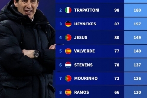 体育资讯9月25日讯 德转盘点了欧联杯历史上主帅赢得积分最多纪录,其中埃梅里居首,本赛季执教维拉的他是否能夺得个人第五座欧联杯冠军值得期待。以下为具体榜单: