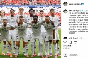 本场比赛受伤的卡瓦哈尔也在社媒晒出全队合影鼓励球队,配文写道:“这不是我们想要的结果。我们需要改进的地方还有很多,我们首先要进行自我反省。接下来的路就是继续努力,从错误中学习,并以更强的姿态重新站起来。赛季还很漫长,还有很多目标需要实现。Hala Madrid! ”