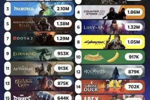 体育资讯10月01日讯 据外媒公布的数据显示,目前Steam平台所有游戏同时在线人数榜单情况如下。