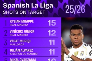 体育资讯10月7日讯 日前,Squawka统计了本赛季西甲射正次数排行,姆巴佩15次居首。