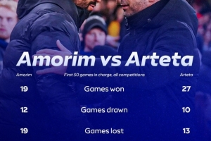 体育资讯10月11日讯 天空体育对比了阿莫林执教曼联前50场比赛,与阿尔特塔执教阿森纳的前50场战绩对比,具体如下(各项赛事):